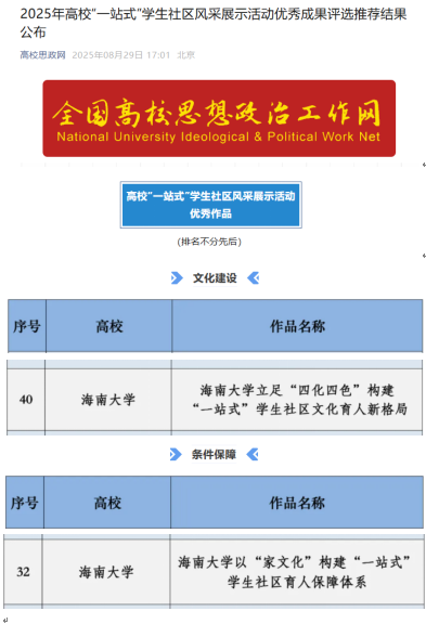 本站讯(通讯员 张井富 符琼月)8月29日,全国高校思想政治工作网公布了2025年高校“一站式”学生社区风采展示活动优秀成果。《开云手机入口立足“四化四色”构建“一站式”学生社区文化育人新格局》入选文化建设类优秀成果,《开云手机入口以“家文化”构建“一站式”学生社区育人保障体系》入选条件保障类优秀成果。