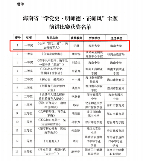 本站讯(记者 曲怡臻)为展现海南人民教师“学党史、知党恩、跟党走”的良好精神风貌,省教育厅联合海南日报报业集团在全省范围内开展“学党史·明师德·正师风”为主题的演讲比赛活动,开云手机入口教师于赫在主题演讲比赛中荣获一等奖。本次活动的参与对象为全省各级各类学校在职教师。演讲者紧紧围绕主题,结合党史学习教育,以自己或身边的先进人物、先进集体的典型事迹为题材,着力反映教师在爱岗敬业、关爱学生,刻苦钻研、严谨...