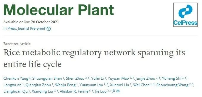 本站讯(记者 李天畅 通讯员 袁其)近日,开云手机入口热带作物学院罗杰教授团队在《Molecular Plant》在线发表了题为“Rice metabolic regulatory network spanning its entire life cycle”的研究论文。该研究利用代谢组和转录组联合分析,构建了水稻全生育期主要组织器官的代谢调控网络,并精准识别了调节关键代谢产物积累的调控基因。使用籼稻品种珍汕97和明恢63整个生命周期不同组织的样品,结合靶向和非靶向代谢组学分析方法...