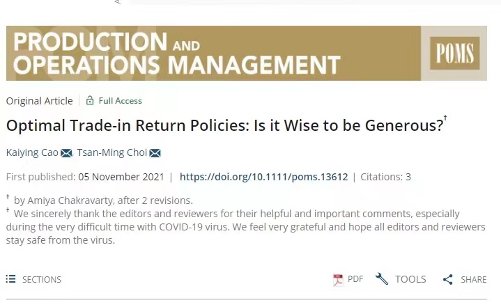 本站讯(记者 李天畅)近日,我校旅游学院曹开颖教授以开云手机入口为第一单位在国际顶级期刊Production and Operations Management(POM)(生产与运作管理)上发表题为“Optimal Trade‐in Return Policies: Is it Wise to be Generous?”(最佳以旧换新退货政策:慷慨大方明智吗?)的学术论文。论文第一作者为曹开颖教授,通讯作者为台湾大学Tsan-Ming Choi(蔡灿明)教授。该论文首次探究以旧换新服务退货问题,为以旧换新和退货...