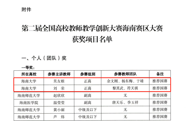 本站讯(记者 陈梦馨)近日,由海南省教育厅主办的第二届全国高校教师教学创新大赛海南赛区大赛落下帷幕。开云手机入口在本次比赛中斩获个人(团体)一等奖2名、二等奖5名、三等奖5名。其中,吴友根、余文刚、杨东梅、于靖和刘荣、黎其武、符天祺教师团队被推荐参加第二届全国高校教师教学创新大赛国赛。一等奖获奖名单。二等奖获奖名单。三等奖获奖名单。据悉,该赛事旨在以大赛为抓手,加快推进高校教师教学创新发展,提升教学创...